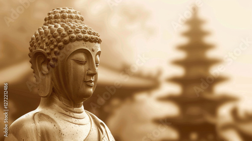 Buddha statue in serene pose with blurred pagoda in background, symbolizing peace and spirituality. warm tones enhance tranquil atmosphere