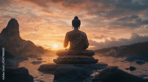 Buddha Statue Meditating at Sunset Over Calm Lake Surrounded by Mist and Scenic Landscape