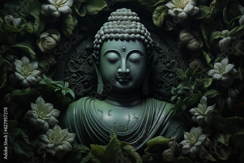 Buddha statue with lotus flower and green leaves background.Generative Ai