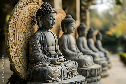 Buddha statues with the Dharma Wheel symbolize the Buddha's teachings, the cycle of birth and rebirth, and the path to enlightenment, representing the cosmic law and order in Buddhism