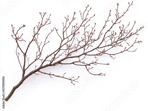 Budding branch on bright white backdrop creating a serene and minimalist composition for spring season