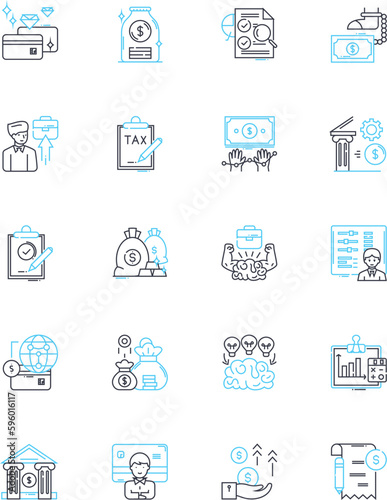 Budget analysis linear icons set. Allocation, Forecasting, Planning, Expenses, Savings, Cost, Revenue line vector and concept signs. Budgeting,Analysis,Tracking outline illustrations