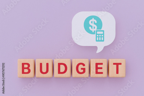 Budget marketing concept with wooden blocks and speech bubble showing dollar sign and calculator on pastel background