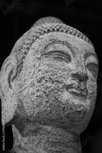 Budha face close up. Close up of a buddha head on black background. Bhuddha statue of stone