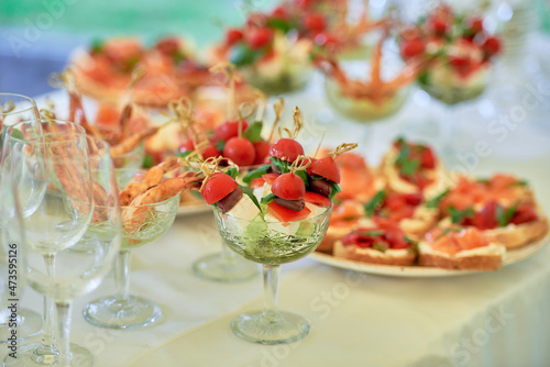 Buffet table with snacks, canape, sandwiches and appetizers at luxury wedding reception outdoors, copy space. Serving food. Catering banquet table