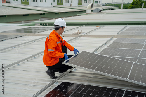 Builder mounting photovoltaic solar modules on roof of house. Back view of man engineer in helmet installing solar panel system outdoors. Concept of alternative and renewable energy.