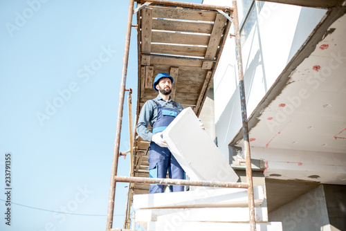 Builder warming a building facade with foam panels standing on the scaffoldings on the construction site