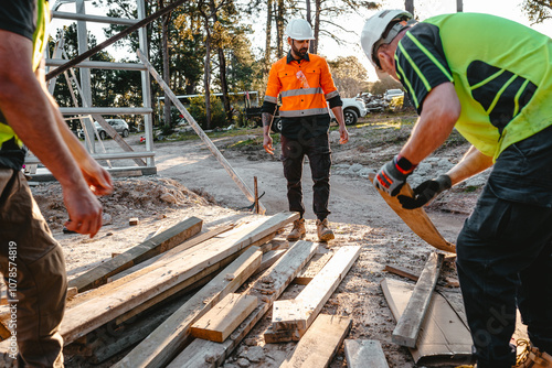 Builders sorting and checking wooden planks on the ground.
