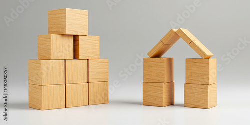 Building a dream home with wooden blocks symbolizing childhood play and family hope under soft on transparent background