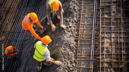 Building a Strong Foundation: Construction Team Ensuring Safety and Teamwork While Installing Reinforcement at a Dam Site