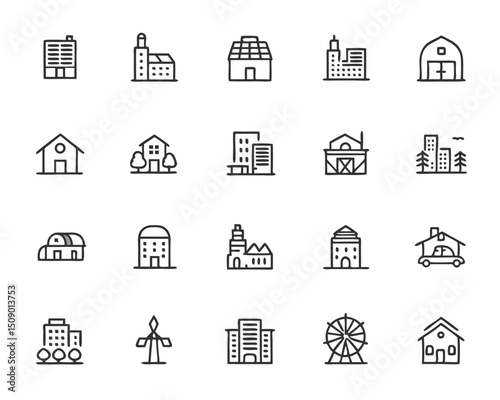 Building architecture icons set city skyline construction real estate urban landscape vector line art design