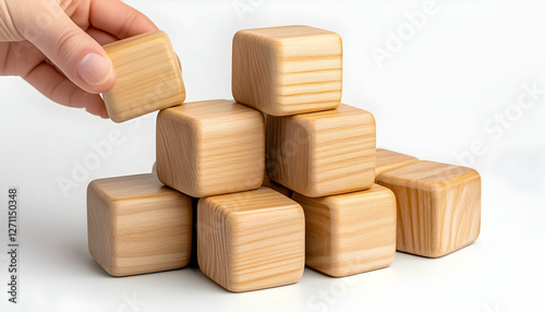 Building blocks pyramid with wooden cubes. Hand adds block on white background