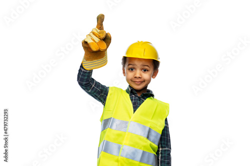 building, construction and profession concept - smiling little boy in protective glove, yellow safety vest and helmet pointing finger up over white background