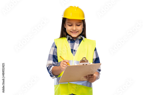 building, construction and profession concept - smiling little girl in protective helmet and safety vest with clipboard and pencil over white background