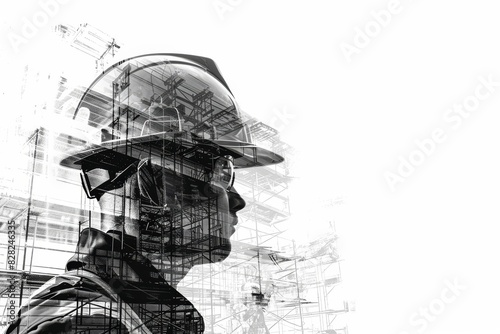 Building construction engineering with double exposure graphic design black and white , construction workers with civil equipment technology 2d illustration on a white background, AI generated