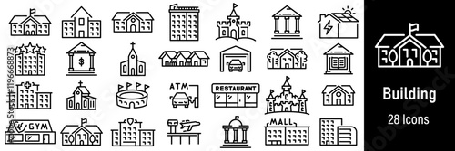Building Web Icons. Infrastructure, Airport, Police, Hotel, House. Vector in Line Style Icons
