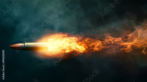 Bullet in motion with fiery trail, dark smoky background. Action and speed concept