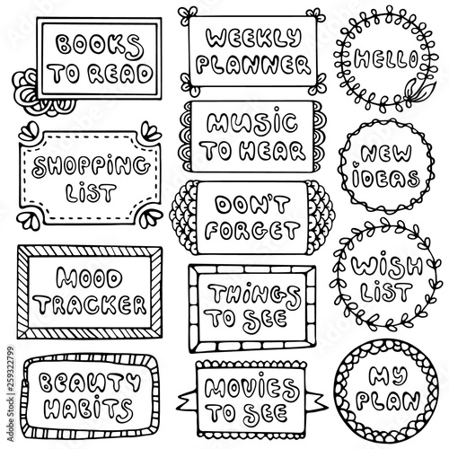 Bullet journal hand drawn vector elements for notebook, diary and planner.