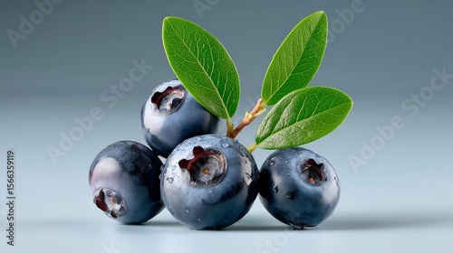 Bunch of blueberries with a leaf on top. The blueberries are wet and shiny. The leaf is green and has a few drops of water on it