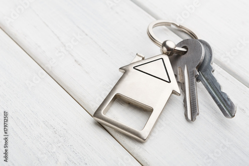 Bunch of keys with house shaped keychain on white wood