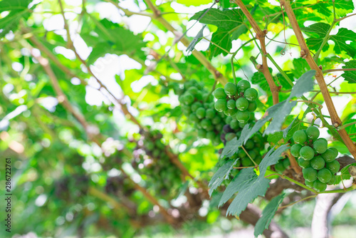 Bunch of red and white grape at vine. ripe purple bunch. outdoor harvesting season concept.Vineyard