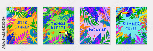 Bundle of summer vector illustration with bright tropical leaves,flowers and toucan.Multicolor plants with hand drawn texture.Exotic backgrounds perfect for prints,banners,invitations,social media