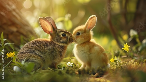 Bunny Rabbit and Chick Sharing a Sweet Kiss in a Spring Meadow