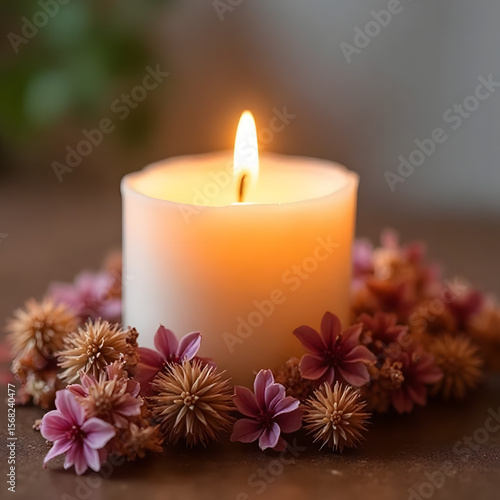burning candle and flowers
