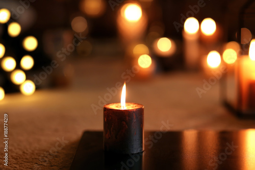 Burning candle on board indoors