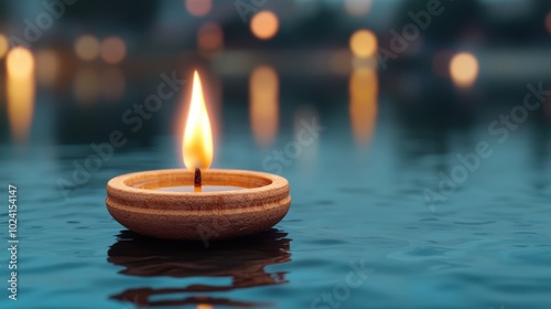 Burning Candle on Water with Bokeh Lights Background Serenity and Peace