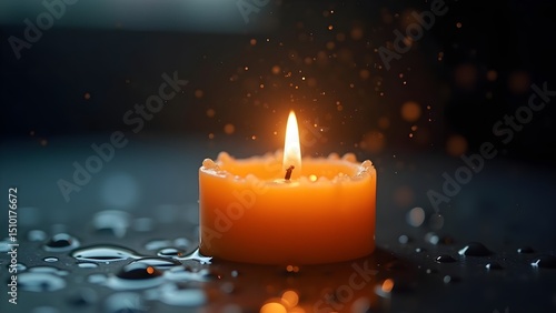 Burning Candle Suspended in Time Surrounded by Floating Water Droplets