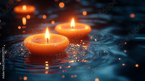 Burning candles float gently in water, casting a warm, inviting glow during Diwali. This serene scene symbolizes hope, joy, and the triumph of light over darkness, capturing the festive spirit of the