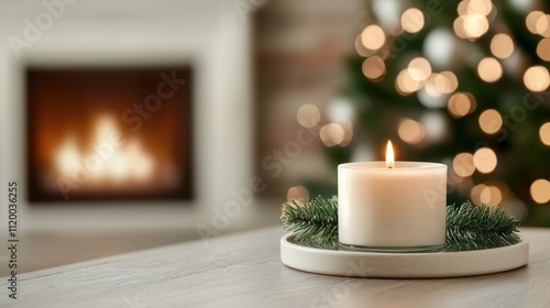 Burning christmas candle creating cozy atmosphere in front of fireplace