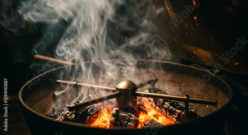 Burning Embers with Smoke Rising Inside Cooking Vessel for Heat and Warmth