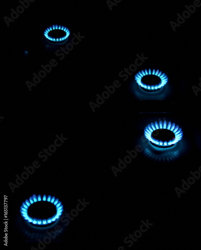 burning gas stove hob blue flames close up in the dark with inverted reflection on black background