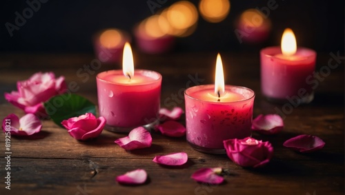 Burning pink candles with rose petals on wooden table. Romantic background.