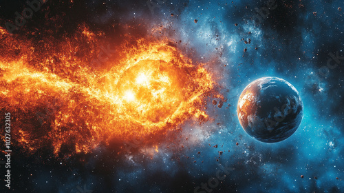 burning planet Earth in space, set against a bright blue backdrop. This powerful visual symbolizes climate change, environmental crisis, and the urgent need for global awareness