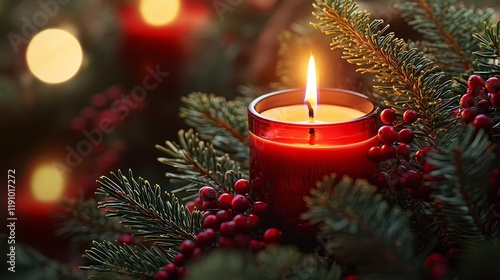 Burning Red Candle in Festive Arrangement, Christmas, Holiday, Winter Christmas, Candlelight