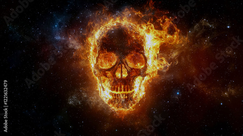 Burning Skull in Cosmic Inferno: A fiery skull engulfed in flames against a backdrop of nebulae and stars. A breathtaking cosmic horror scene.