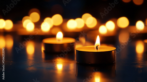 Burning Tea Light Candles in Dark Background, Warm Ambient Lighting, Remembrance, Peace
