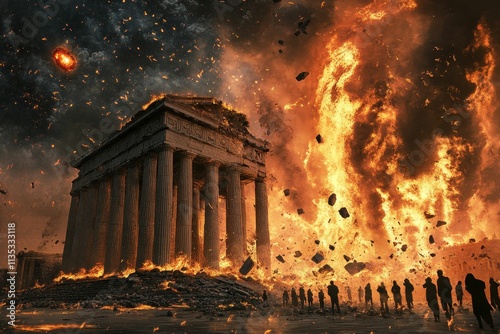 Burning temple, fiery sky, figures observe destruction.