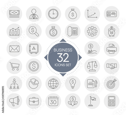 BUSINESS 32 icons set with circles design isolated on white background. Vector.