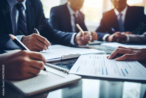 business accounting team meeting in room office using pen pointing at paperwork. finance concept