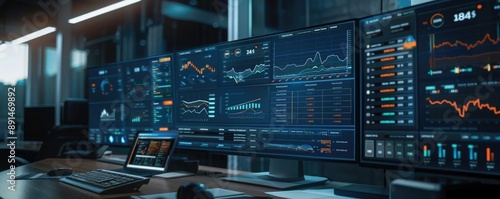 Business analysis screen displaying financial graphs and big data, 3D economic growth, virtual fintech dashboard, digital marketing, global economy