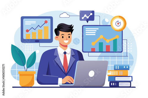Business analyst conducting financial audit analysis with digital dashboards and reports in a modern office setup