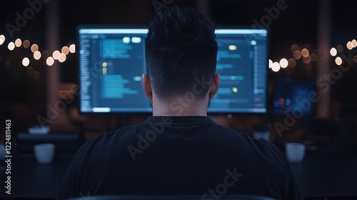 Business Analyst Reviewing Data on Computer Screens in Modern Office Environment at Night