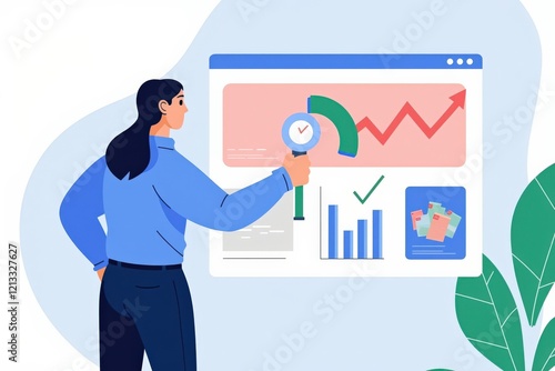 Business Analytics: A Professional Woman Analyzing Data with Magnifying Glass on Screen, Graphs, and Charts Showing Financial Growth in Modern Office