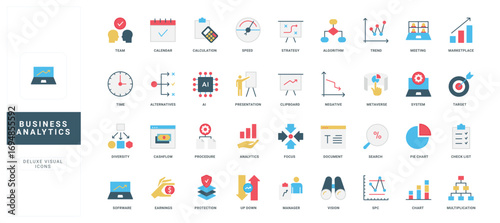 Business analytics, analyst tools and software for trend information analysis, charts report and statistics color icon set. Business presentation and managers vision, research flat vector illustration