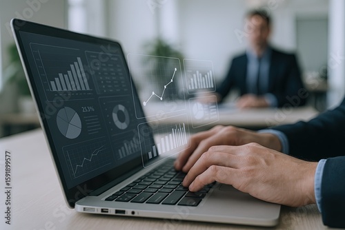 Business Analytics Data Analysis Graphs Charts Laptop Technology Conference Meeting.