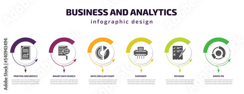 business and analytics infographic template with icons and 6 step or option. business and analytics icons such as printing documents, binary data search, data circular chart, shredder, revision,